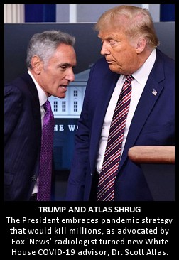 It was an altogether different proposition when the new White House "Covid Health Advisor", Dr. Scott Atlas, recently proposed a strategy to create a naturally occurring "herd immunity" to the deadly COVID-19 virus in the United States. Aside from, somehow, attempting to protect a small group of high-risk individuals --- the elderly, the sick and the immune-compromised --- Atlas' proposed scheme, echoed by the President, would allow the deadly virus to spread quickly to everyone else as they "return to work and to school."