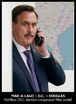 In the meantime, if you happen to see MyPillow CEO Mike Lindell, ask him what he was doing late that night at Coffee county's airport in Douglas, Georgia, right after visiting the nation's capital and Donald Trump's private club, will ya? After all, he'd been photographed the month prior heading into the White House, just a week after the Jan. 6 auto-coup attempt, carrying notes mentioning Sidney Powell --- funder of the unprecedented Coffee County voting system breach --- and citing the Insurrection Act, a legal basis, in certain unhappy circumstances, for declaring martial law.